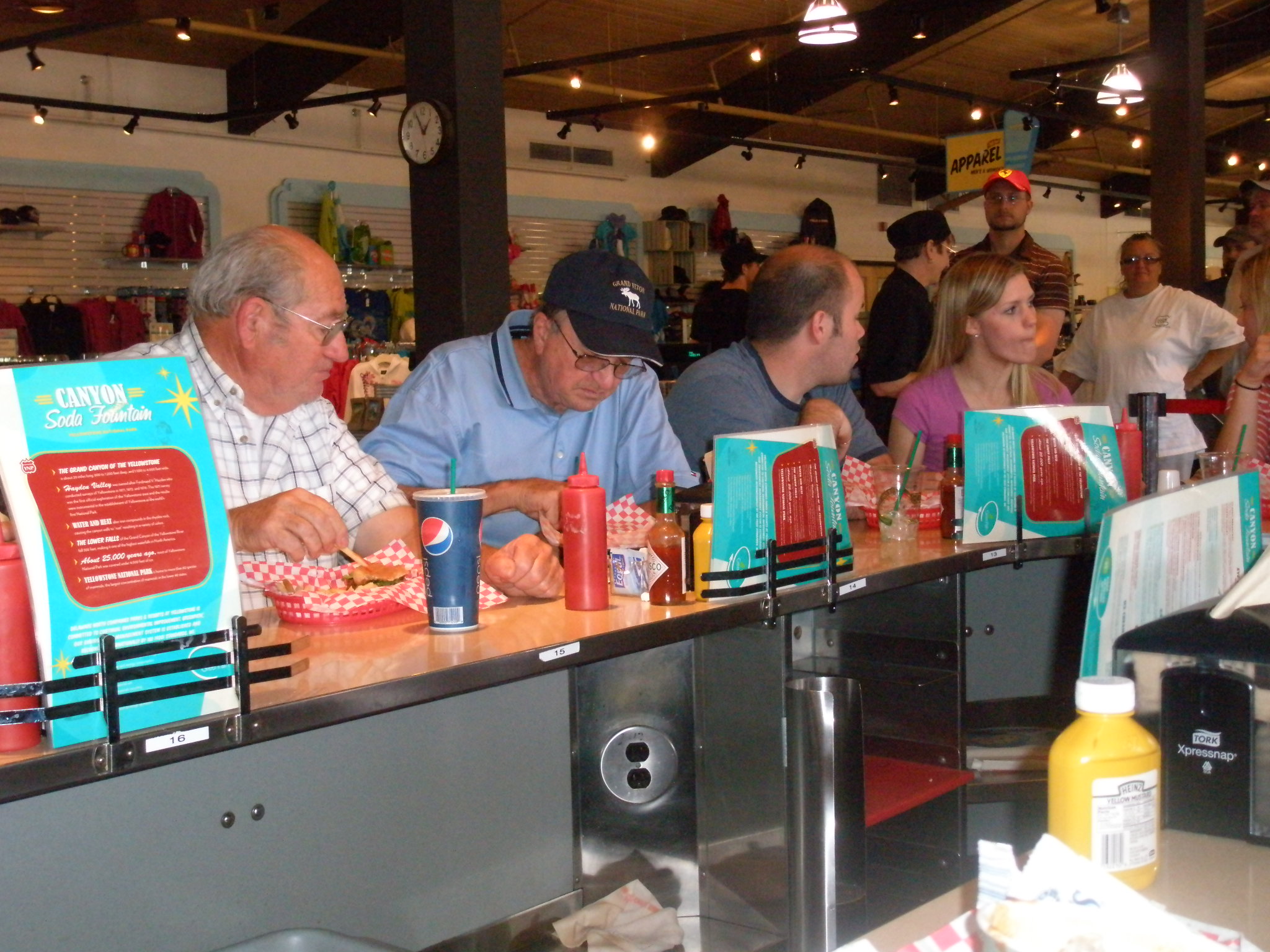 We drove to Lake Yellowstone Hotel (built 1889-1891) for a lunch. Poor Kevin, the season had just begun, and he mets us on a rather quiet day. Richard orders a salmon wrap with french fries. Chris bites a fry and says, these are cold! Would you bring us some hot fries? We don’t see Kevin for a while. I tasted the wrap – dry salmon right out of a can mixed with white rice, corn, green pepper bits, and fresh spinach. (If only I had my Waterpik!) Let’s get everything out of the wrap and on to the plate. Richard folded the giant tortilla in a triangle and wrote Help in ketsup. Kevin brought the hot fries.